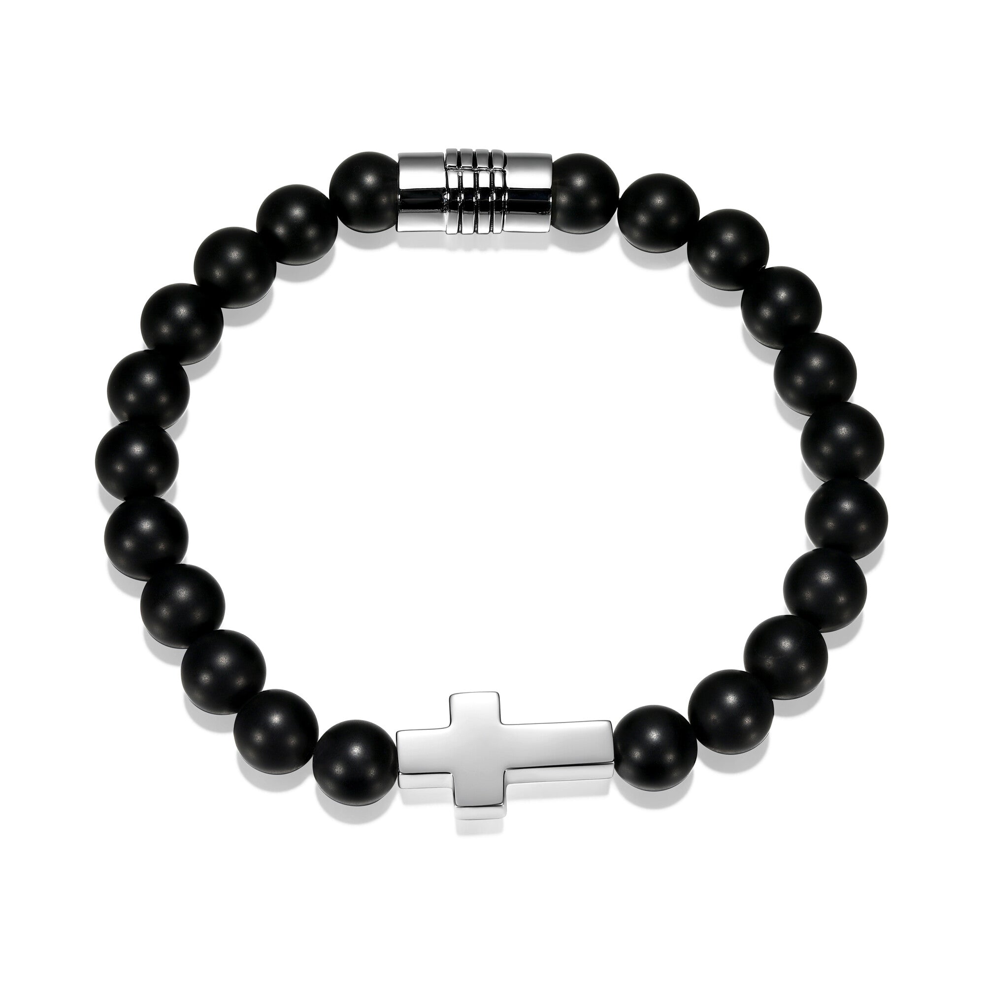 Strata Cross Matte Genuine Black Agate Beaded Bracelet - 7.25"